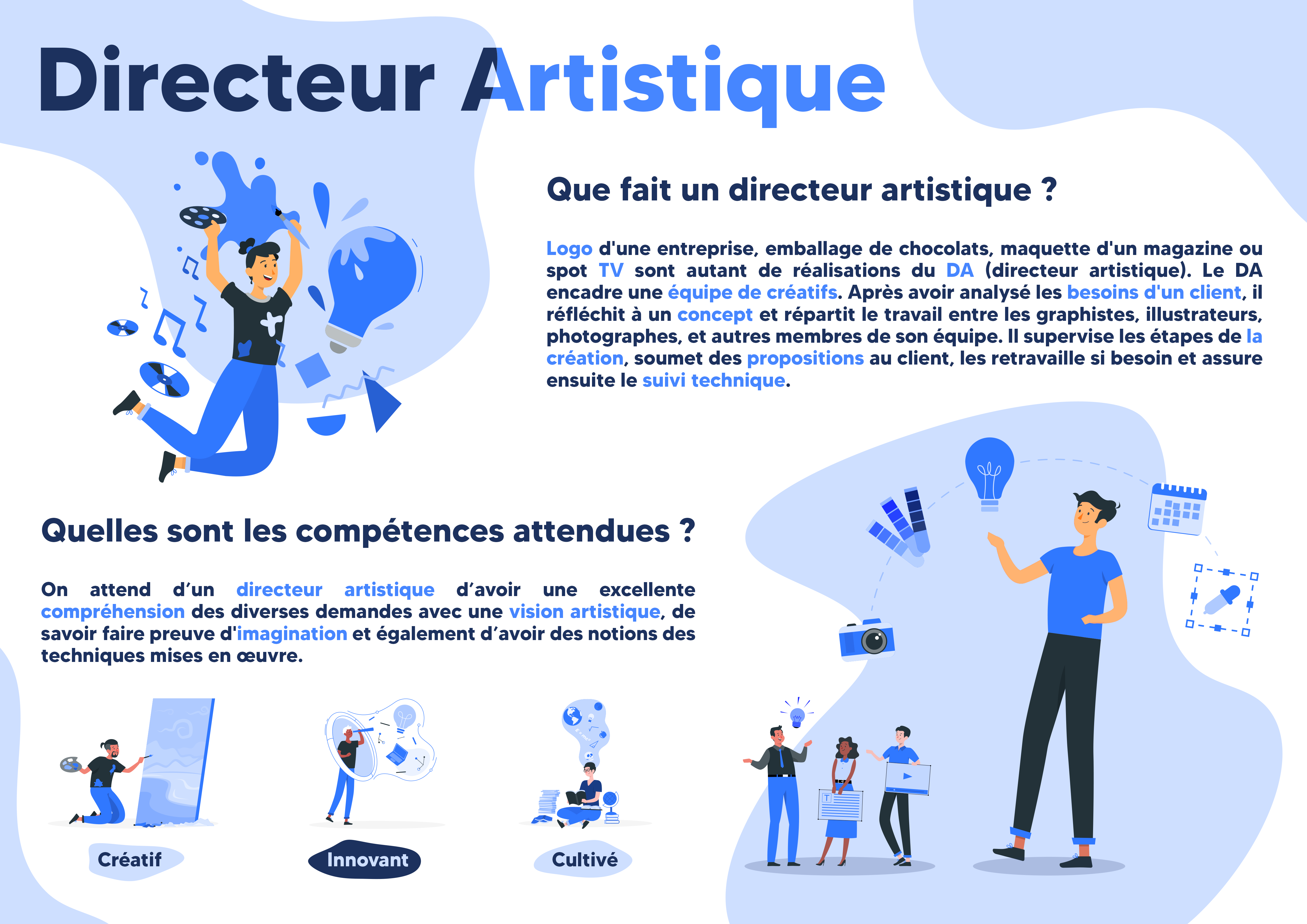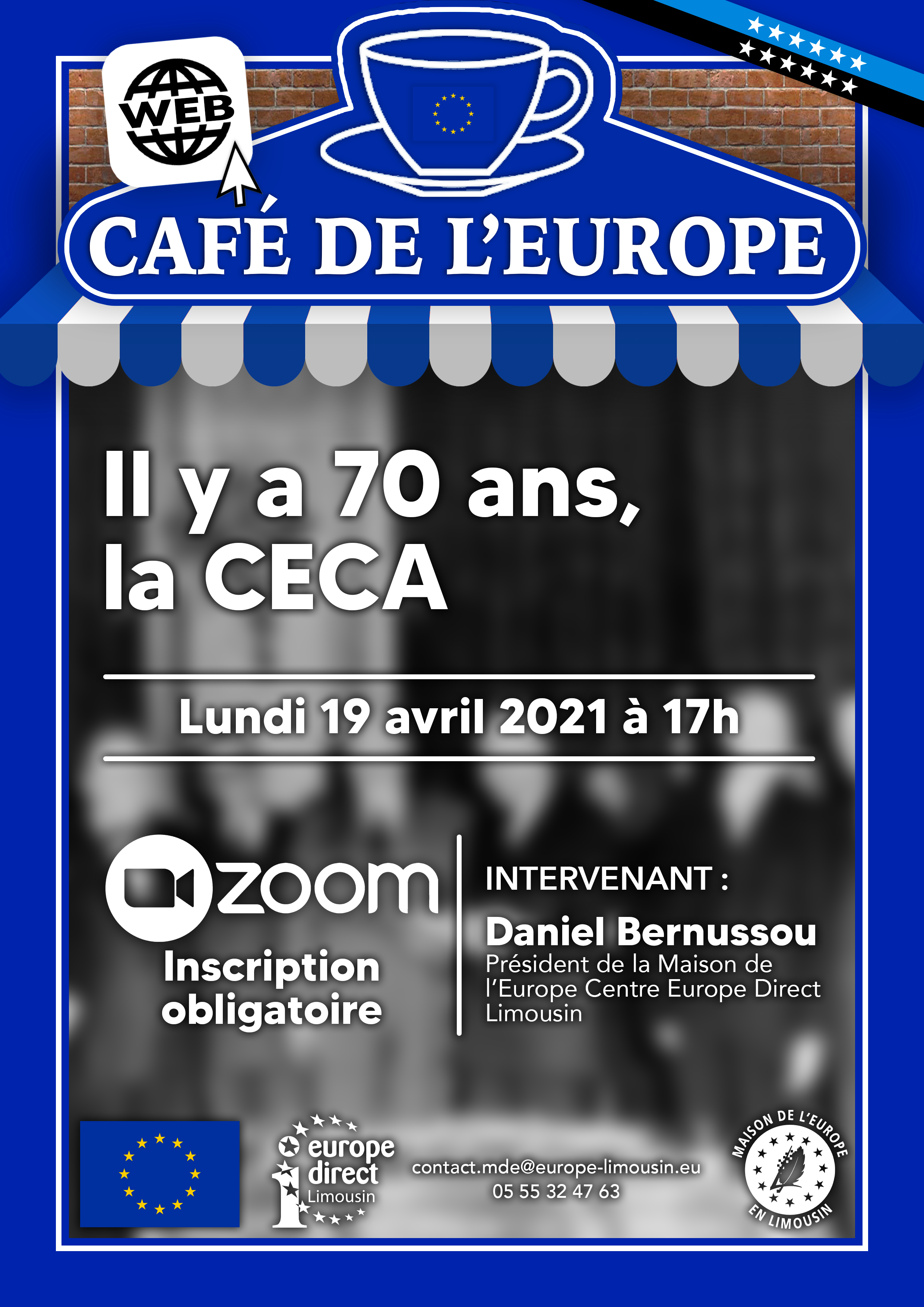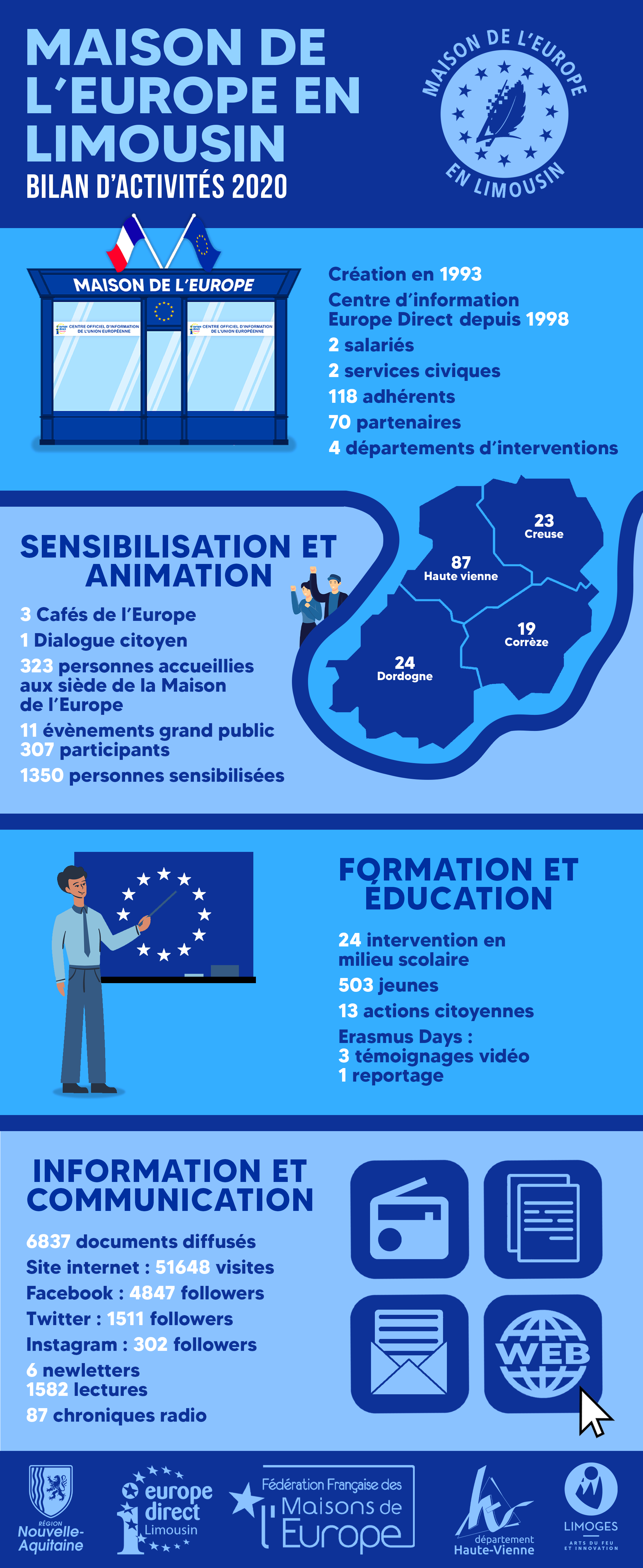 Voici deux affiches et deux infographies. La première affiche était pour un match de futsal, la seconde pour un événement « café de l’Europe ». La première infographie récapitule l’année 2020 de la Maison de l’Europe en Limousin, la seconde présente le métier de directeur artistique.